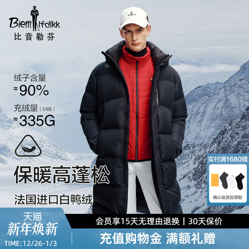 比音勒芬冬季男士东北极寒加厚保暖高充绒量中长款过膝羽绒服连帽