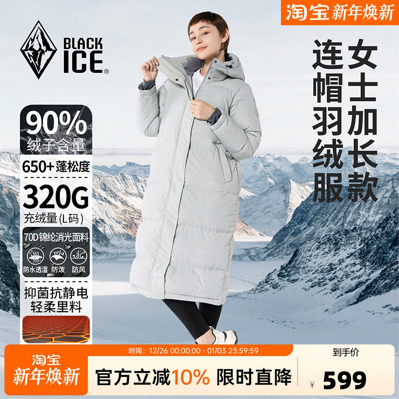 黑冰户外休闲女款鸭绒长款过膝羽绒服防风保暖连帽加长大衣8960