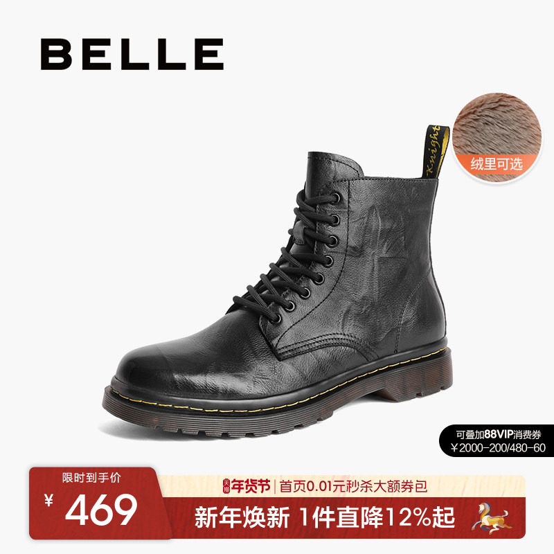 百丽男士高帮马丁靴男冬季新款加绒牛皮英伦短靴厚底增高8CM01DD3