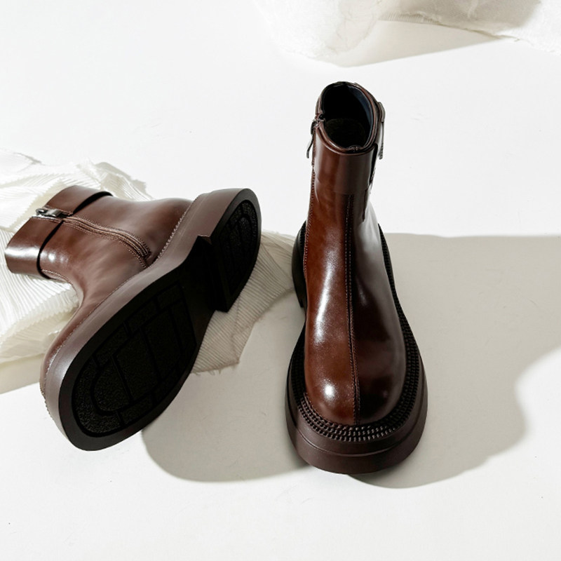 - 短靴女粗跟单靴真皮