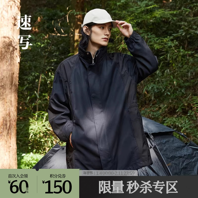 速写outlets奥莱男装春秋季折扣新品风衣中长款外套连帽宽松棉麻