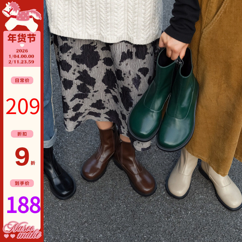 手工真皮英伦风后拉链方头短筒靴羊皮软皮粗跟平底瘦瘦靴马丁靴女