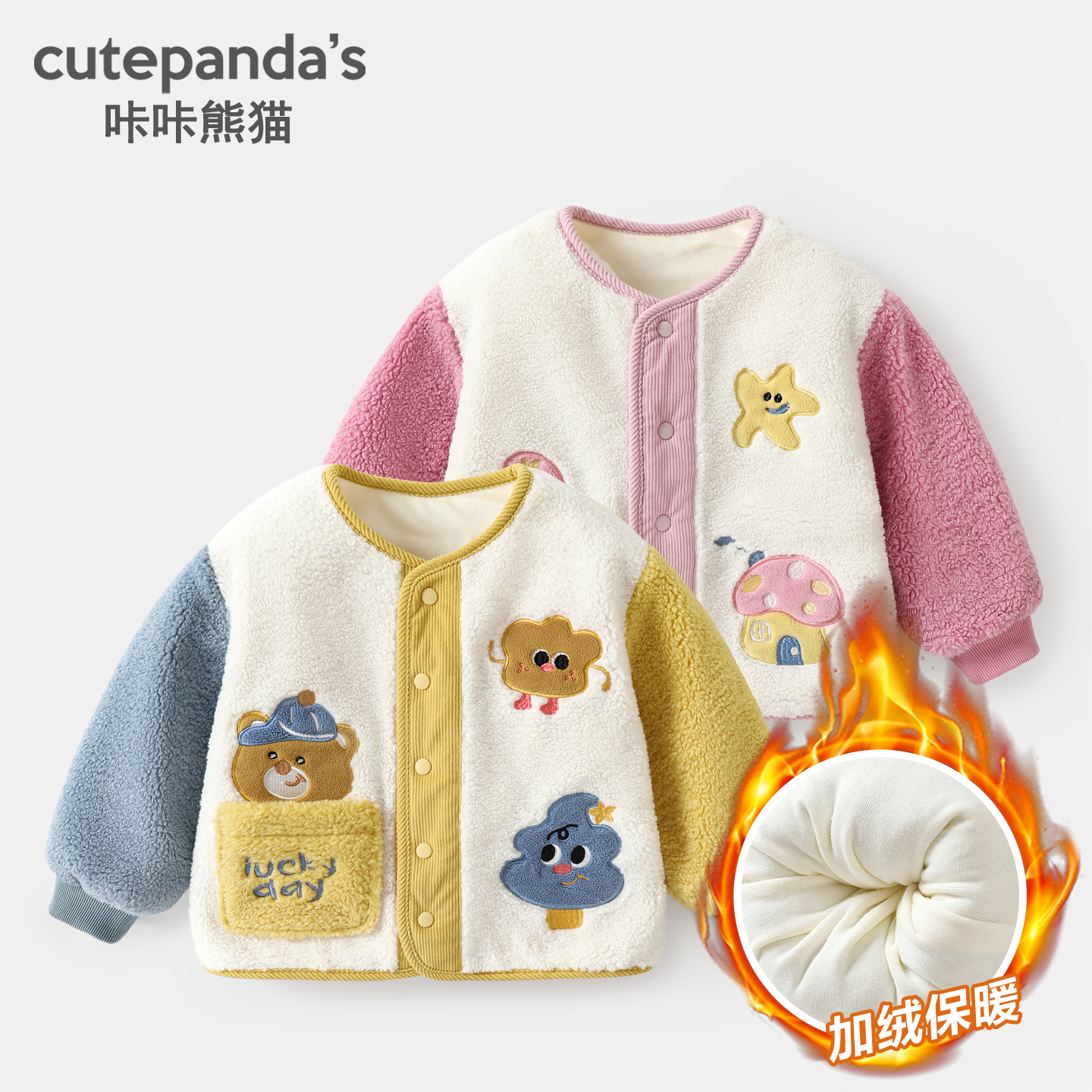 咔咔熊猫男童加绒外套冬款儿童加厚保暖上衣冬装宝宝女童毛绒衣服
