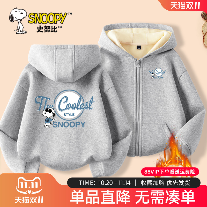 史努比男童加绒外套秋冬款连帽开衫冬季2025新款保暖冬装儿童上衣