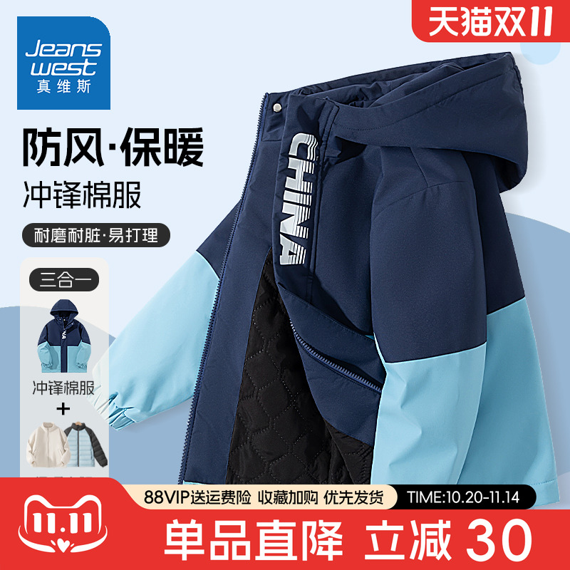 真维斯男童外套秋冬款2025新款男大童夹棉冲锋衣加绒冬季儿童棉服