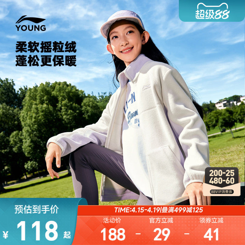 李宁小女孩摇粒绒外套男孩新款秋冬款冬季女童装加绒男中大童冬装