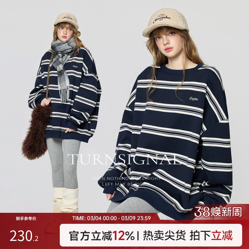 TurnSignal潮牌时尚条纹卫衣女加绒加厚冬季休闲宽松百搭套头上衣