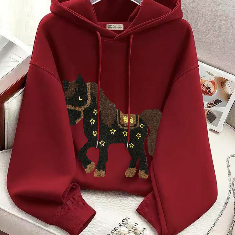 2026新年本命年酒红色连帽卫衣女加绒加厚秋冬时尚洋气上衣外套潮