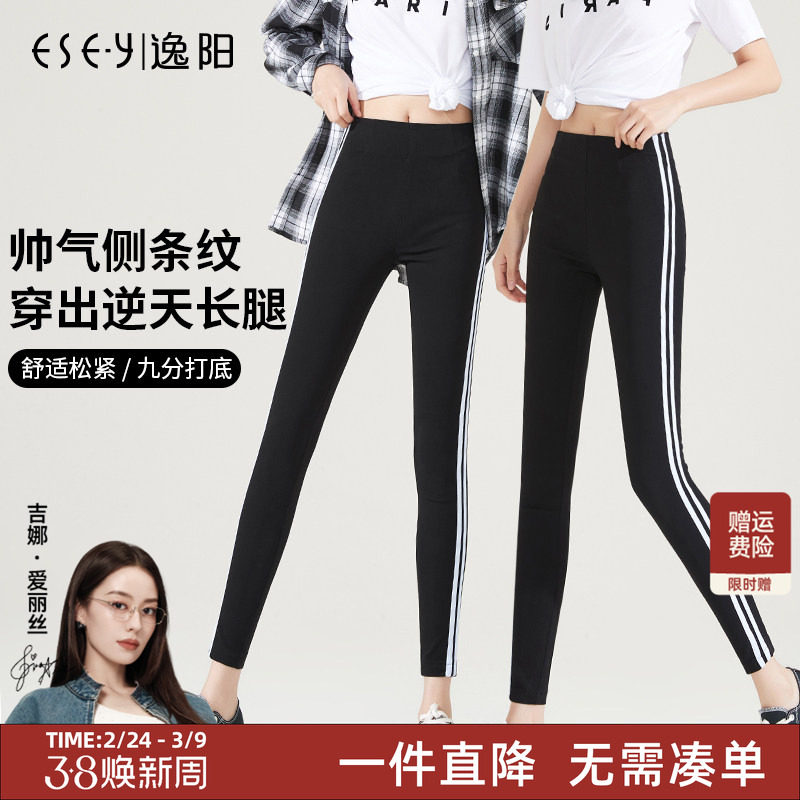 春秋跑步运动学生侧边双杠竖条纹百搭棉质紧身裤小脚九分打底裤女