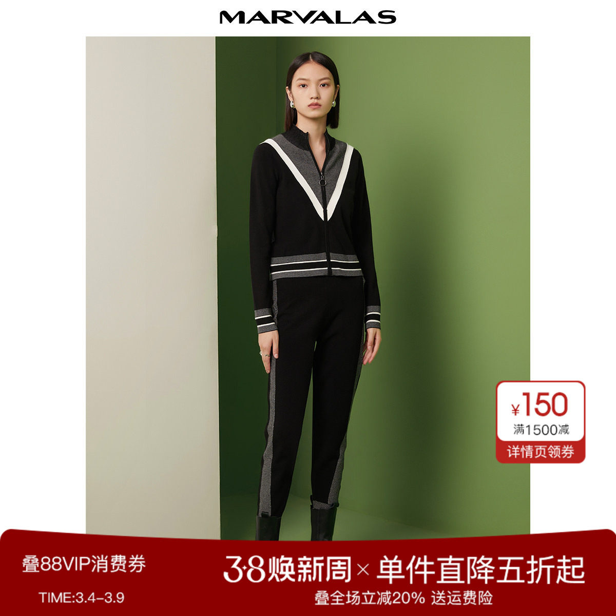曼德诗小脚裤女2024秋季新品针织显瘦时尚条纹九分运动裤休闲裤