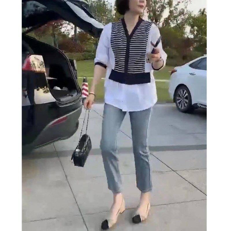 66081大爱美依缘2025夏季新款衬衫拼接条纹宽松上衣小脚九分裤女