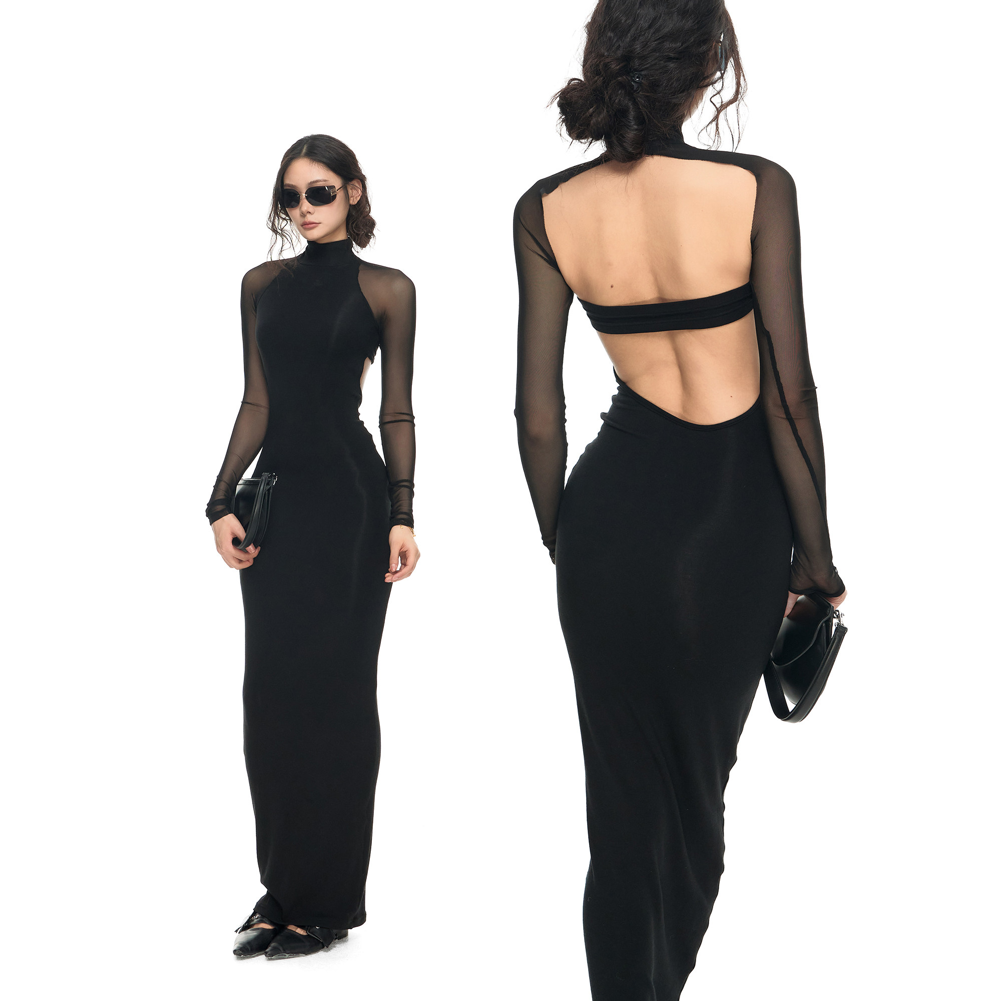 Norain不下雨 黑色性感露背收腰针织包臀裙女气质长袖连衣裙长裙
