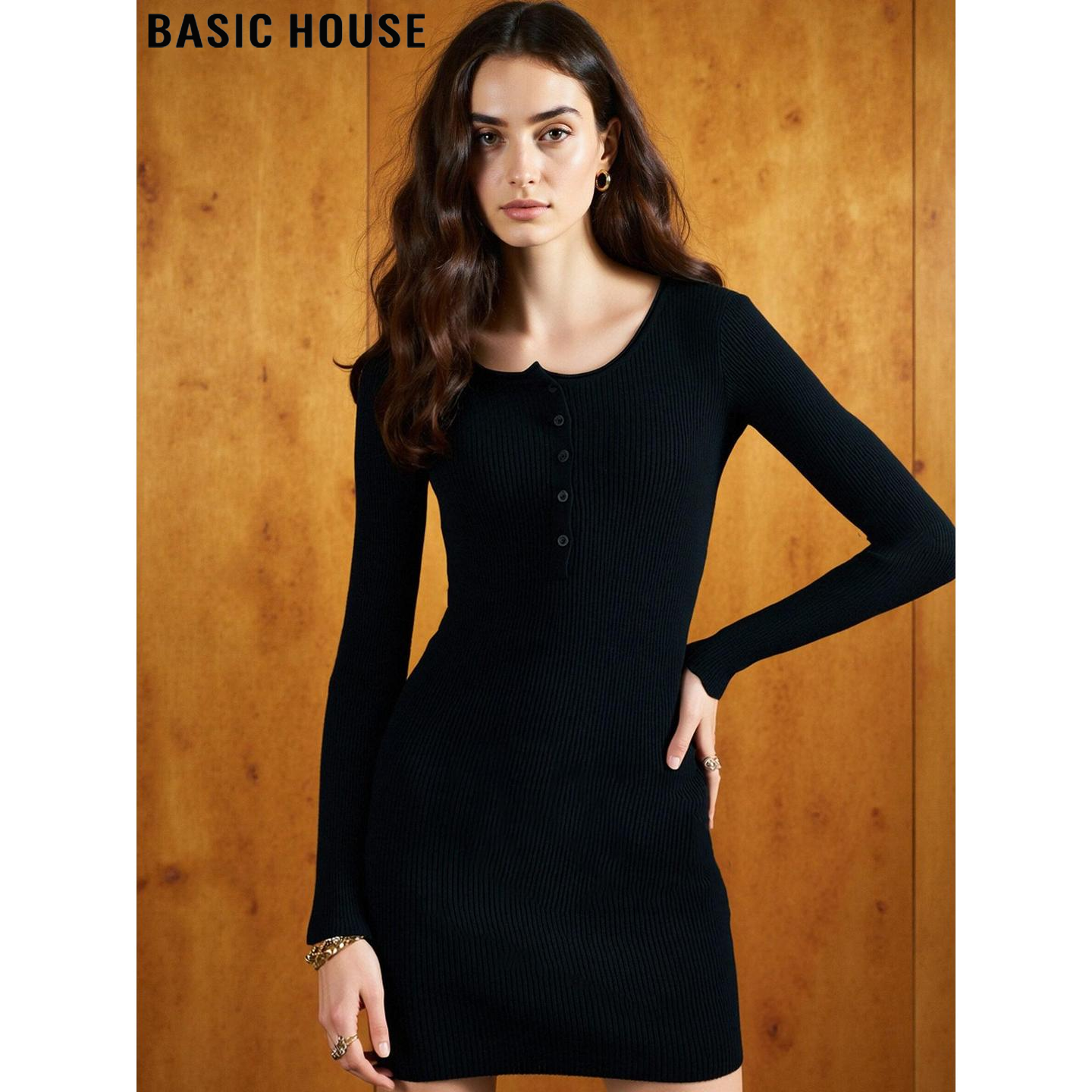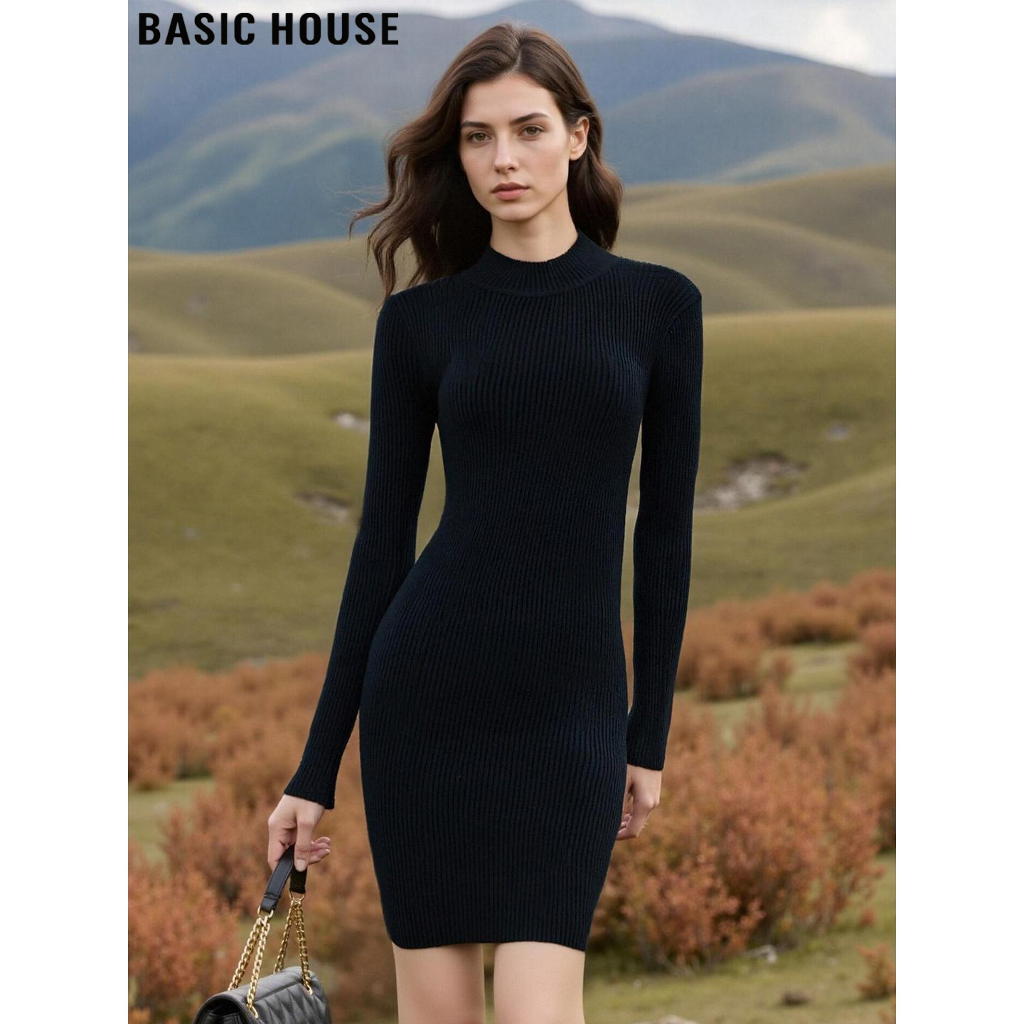 Basic House/百家好黑色半高领连衣裙女士2026春季新款针织包臀裙