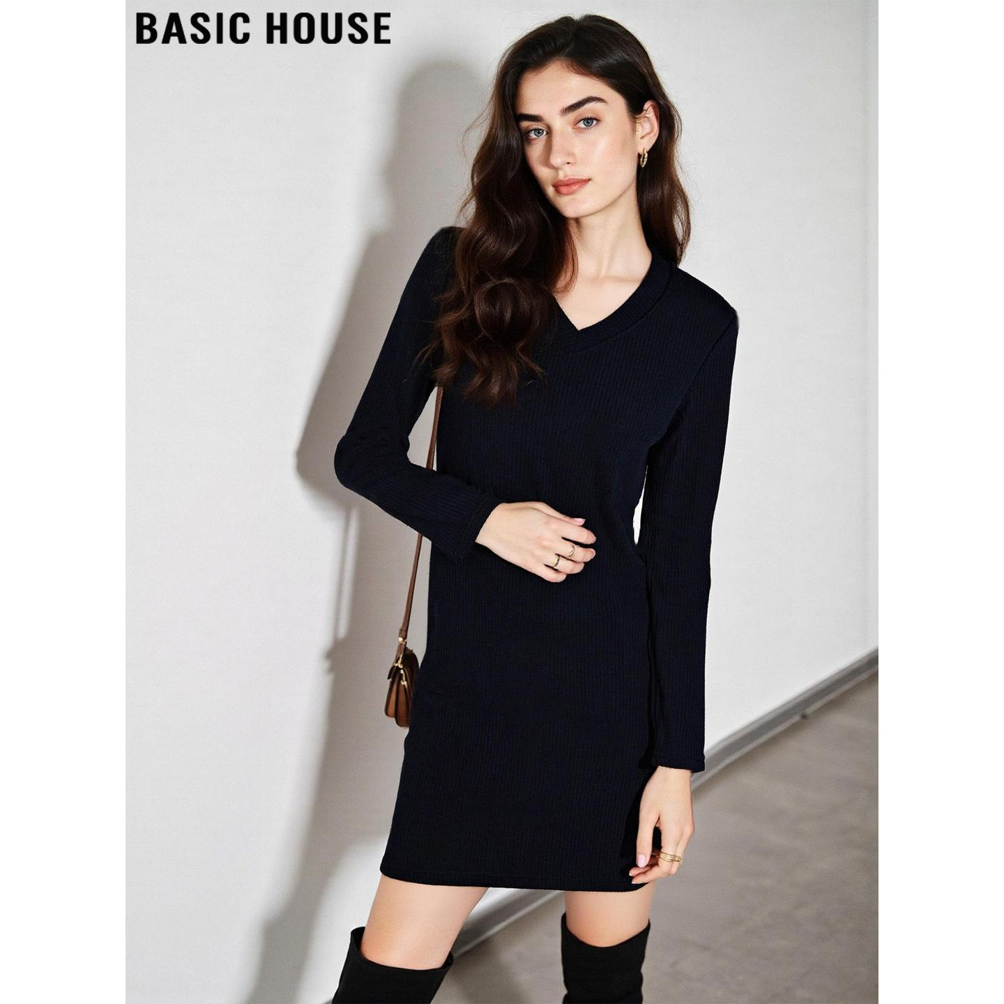 Basic House/百家好黑色V领针织连衣裙女2026春季新款包臀打底裙