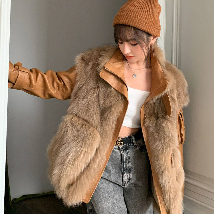 欧洲冬季小熊心事立领染尖花狐貂皮羊毛一体女慵懒风休闲皮草外套