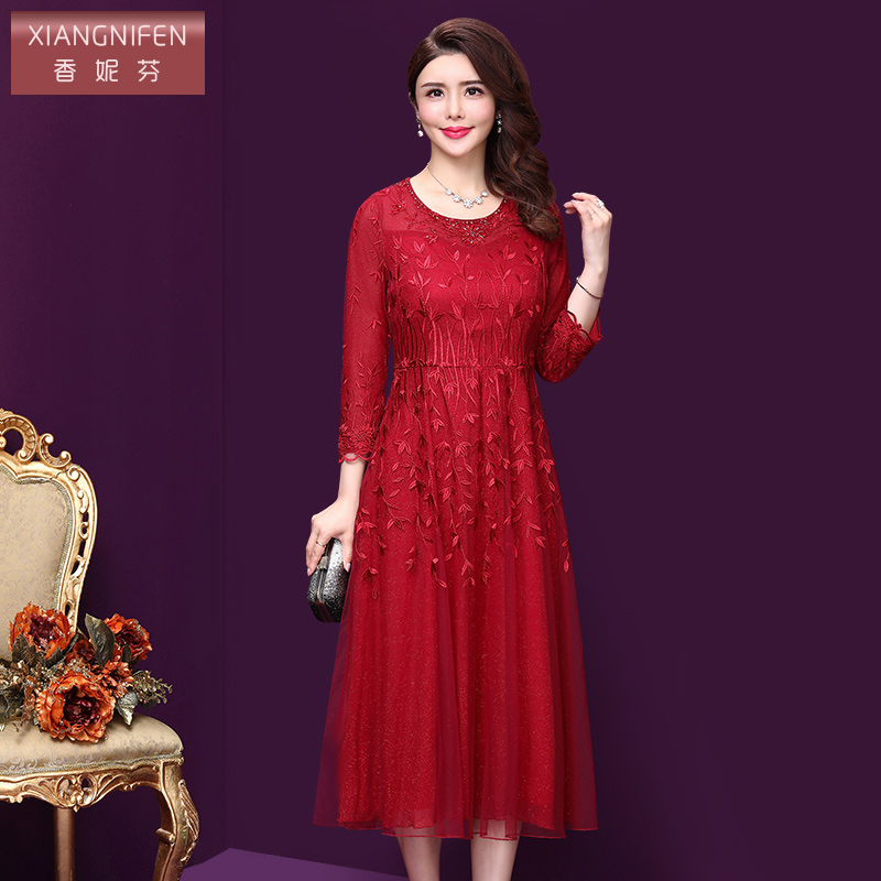 香妮芬秋季新款时尚气质蕾丝熟女刺绣中年妈妈装修身连衣裙2025