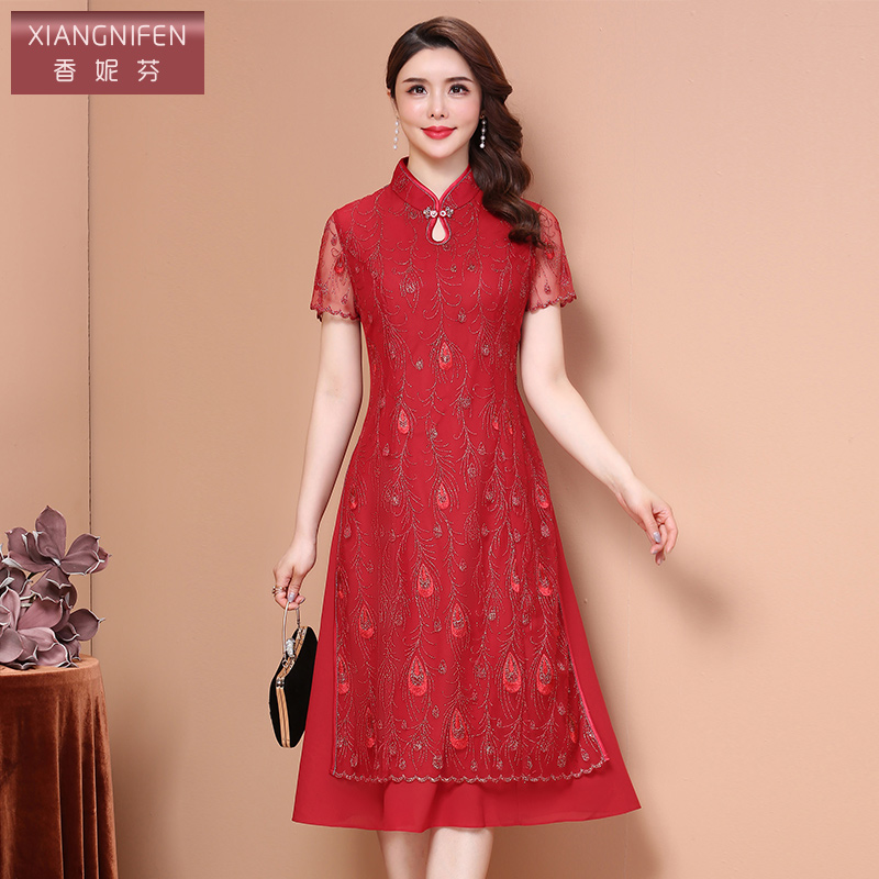 香妮芬2025夏季新品婚礼中年妈妈装刺绣旗袍裙结婚礼服连衣裙宴服