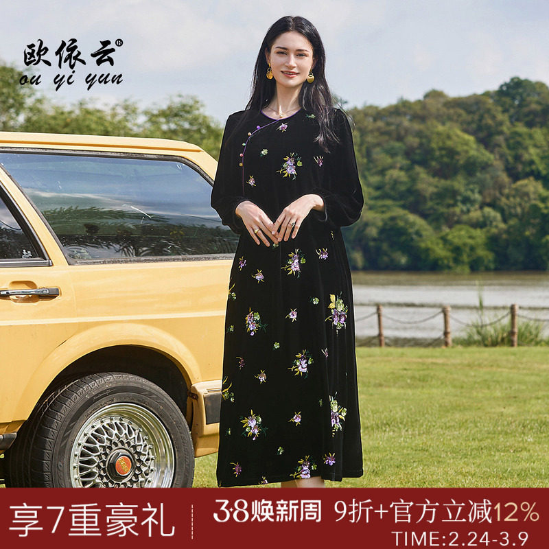 秋季新款复古中式丝绒连衣裙时尚中年妈妈气质高贵绣花中长款裙子