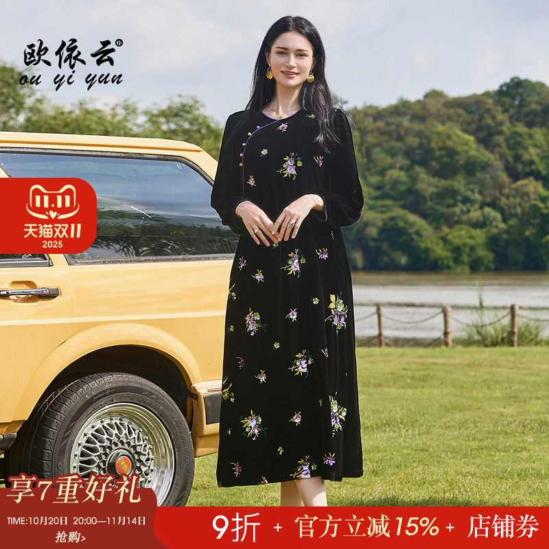 欧依云华丽轻奢连衣裙桑蚕丝刺绣洋气中年妈妈秋装显瘦裙子2025新