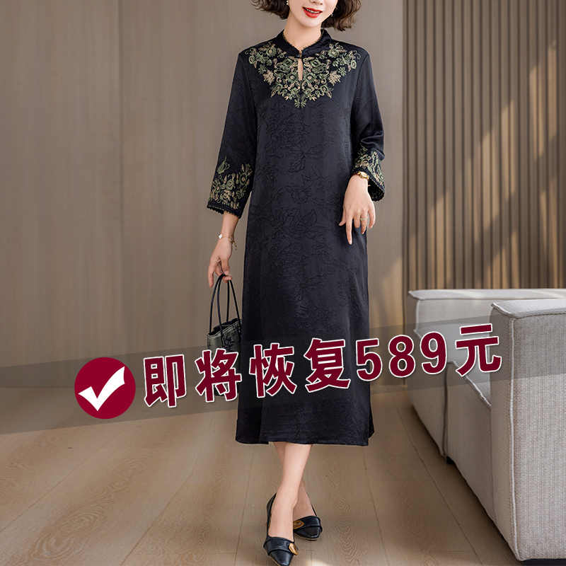 香云纱真丝宽松旗袍裙女气质妈妈中式复古重工刺绣桑蚕丝连衣裙子
