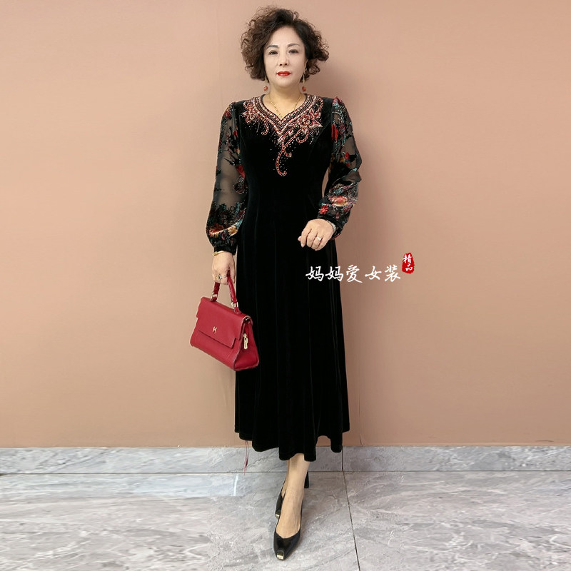 时尚中老年女装连衣裙中长款大码显瘦高端妈妈装春装刺绣金丝绒裙