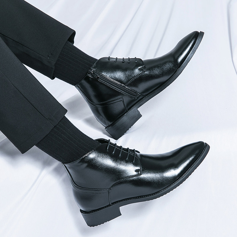 新品尖头韩版皮靴男士高帮皮鞋潮流短靴内增高马丁靴加绒男靴子冬