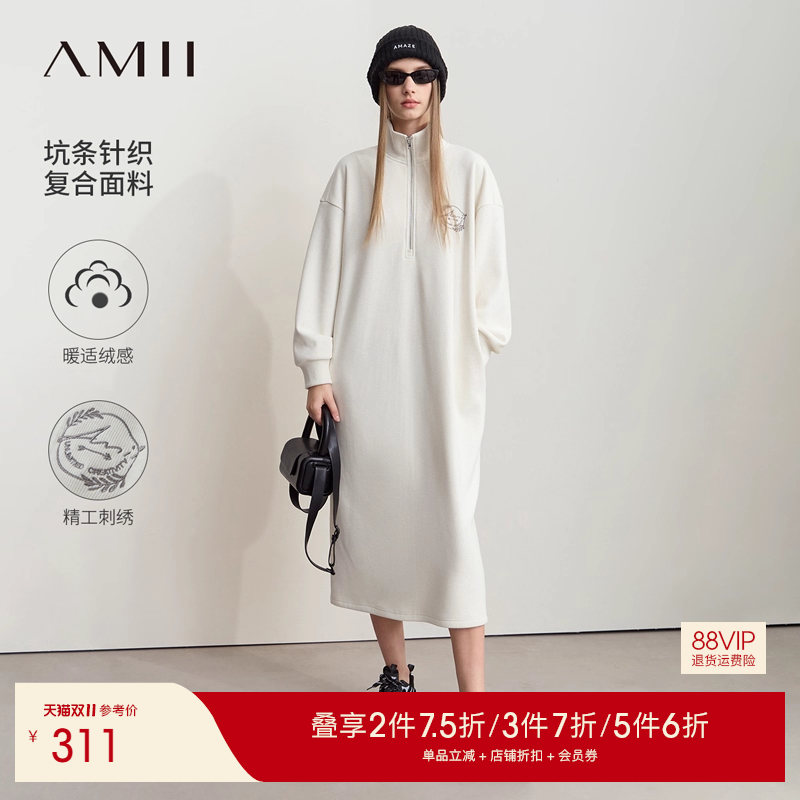 Amii2025冬新款拉链半开襟刺绣连衣裙女高领落肩袖宽松卫衣裙子