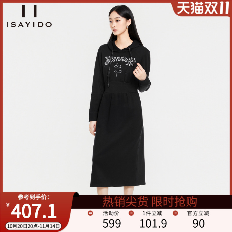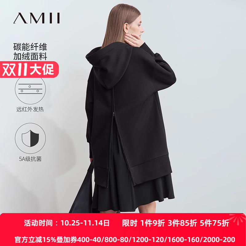 Amii2025冬新款连帽假两件拼接拉链装饰连衣裙女字母刺绣卫衣裙子