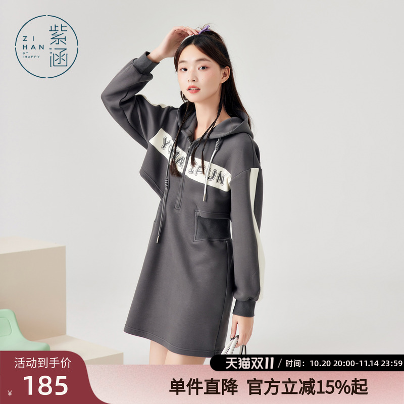 紫涵拉链门襟连帽卫衣裙子女春秋季新款休闲运动风收腰长袖连衣裙