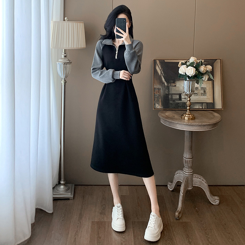 法式气质连衣裙女2025秋冬季新款黑色收腰显瘦翻领高级感卫衣裙子