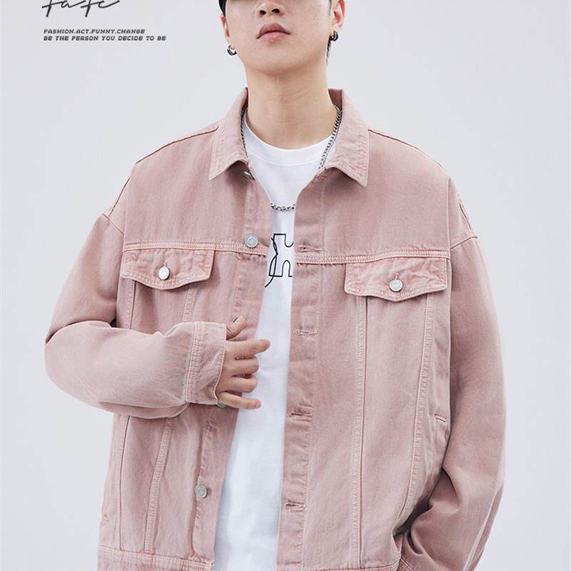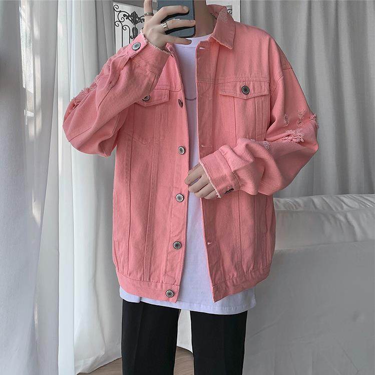 秋季粉色牛仔外套男潮流韩版修身百搭破洞网红同款外穿周杰伦夹克