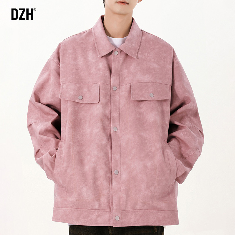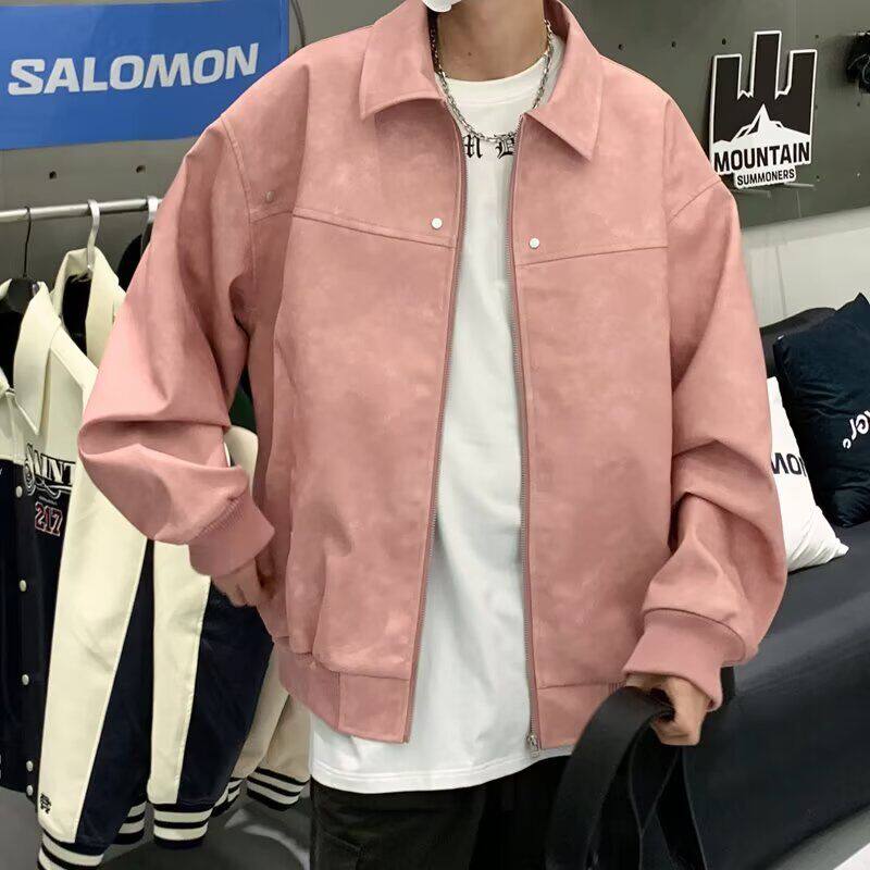 复古粉色麂皮绒PU皮外套男装春秋季高街痞帅炸街工装运动皮夹克衫