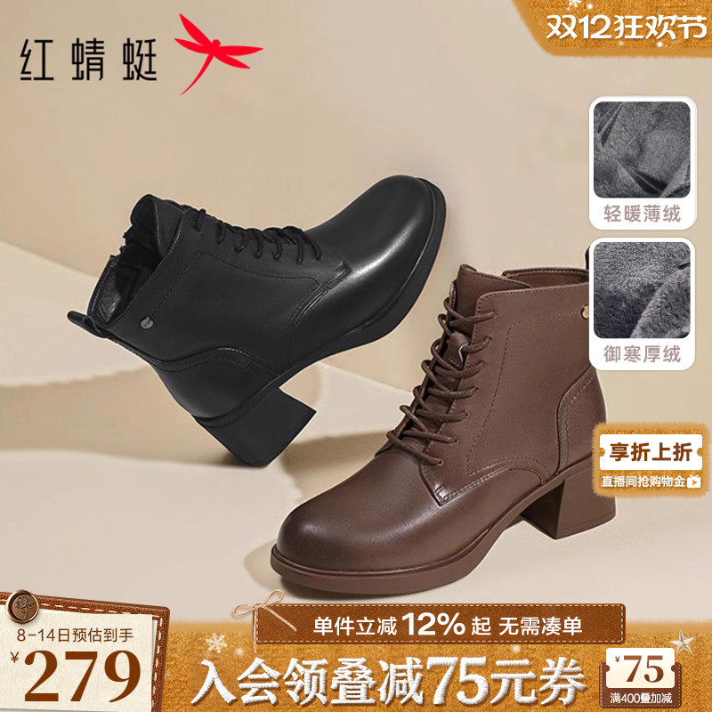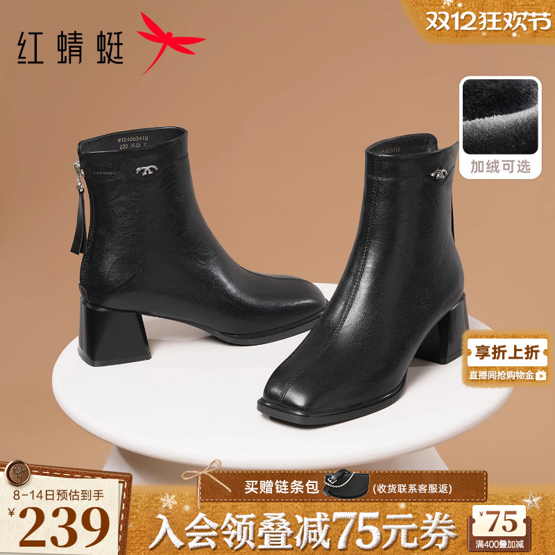 红蜻蜓妈妈靴子2025冬靴新款女鞋女士短靴高跟鞋子粗跟加绒皮鞋女