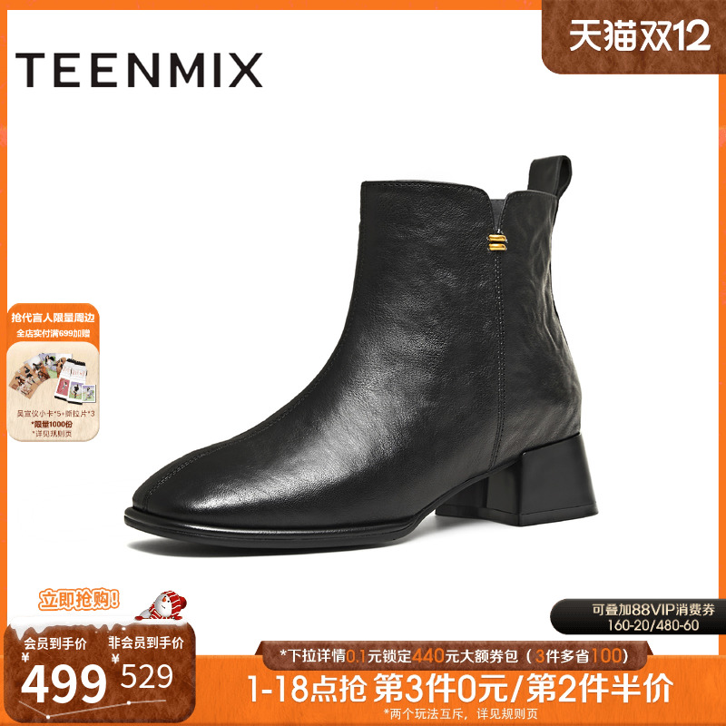 天美意方头粗跟厚底时装靴短靴女高跟鞋皮靴子2025冬新款BL991DD5