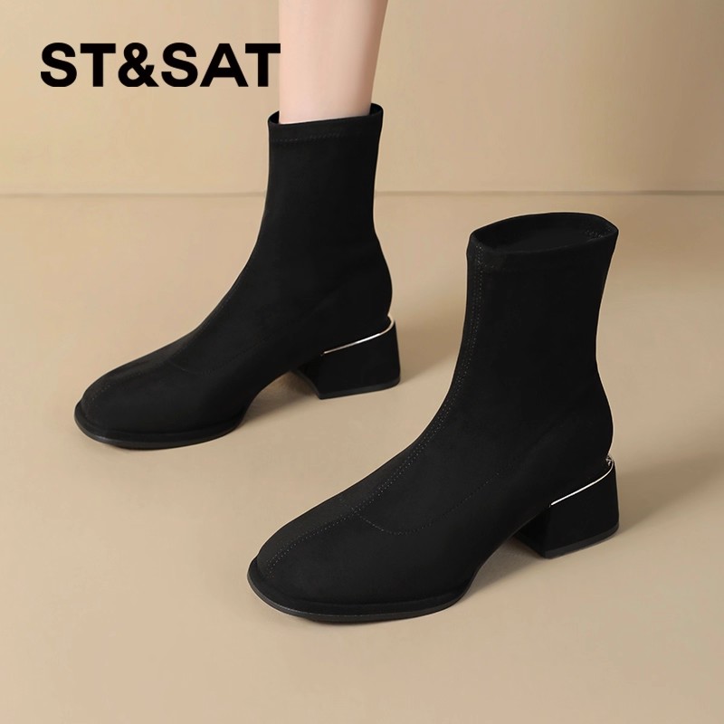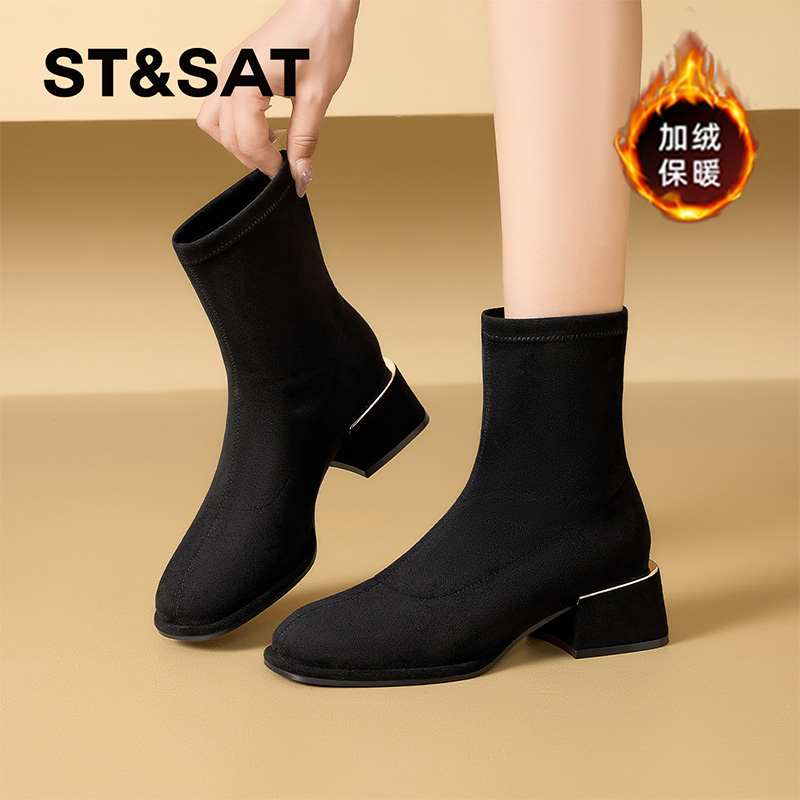 星期六粗跟加绒短靴女款2025新款冬季瘦瘦弹力袜靴马丁靴黑色靴子