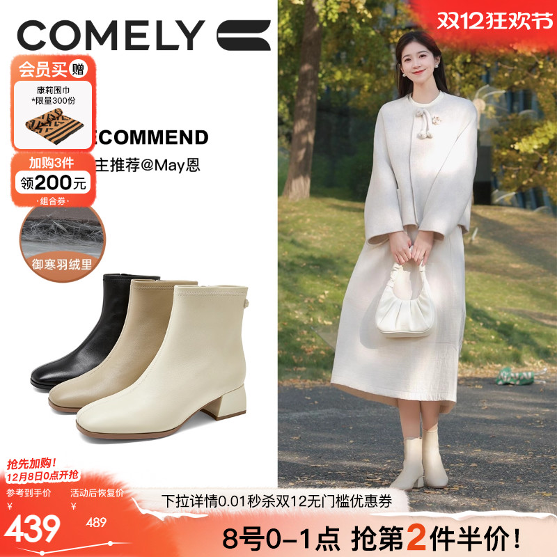 [明星同款]康莉羊皮粗跟短靴女25冬新款时尚百搭洋气黑色靴子加绒