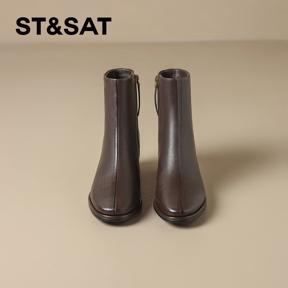 思加图新款锈色海棠短靴粗跟美拉德时装靴加绒女靴子EYJ03DD5