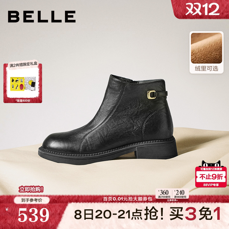 百丽超软羊皮显瘦粗跟短靴子女冬季新款加绒显瘦时装靴E4Y1DDD5