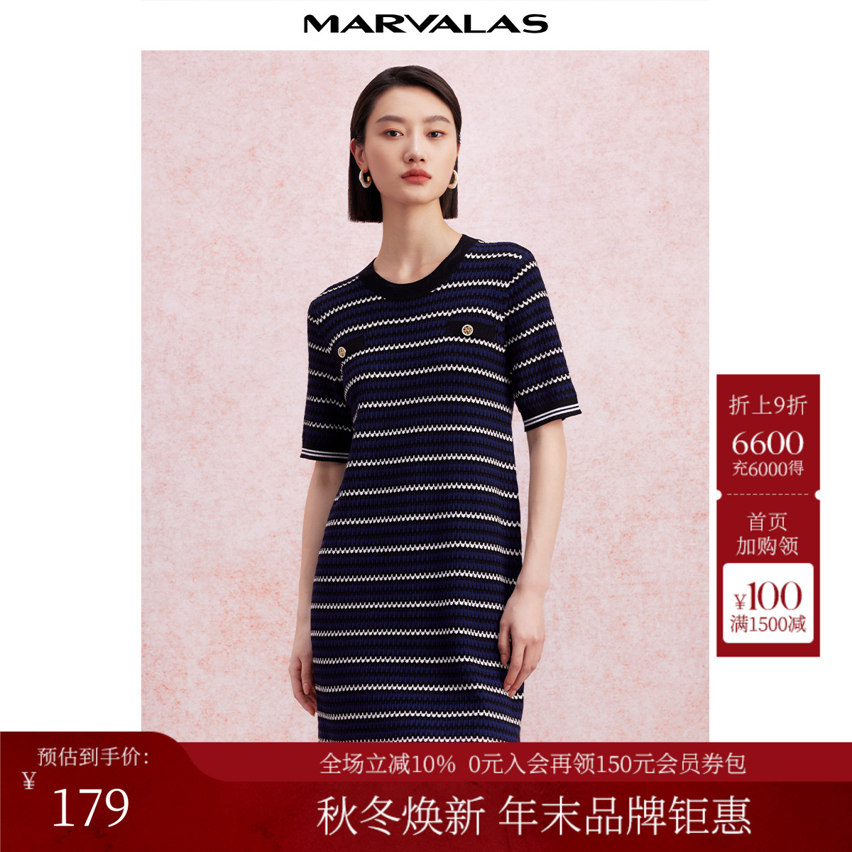 曼德诗条纹针织连衣裙2025秋季新款弹力法式优雅风圆领复古一步裙