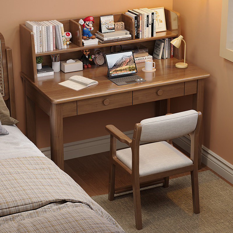 带书架一体实木书桌卧室儿童学习写字台书房学生电脑工作桌带抽屉