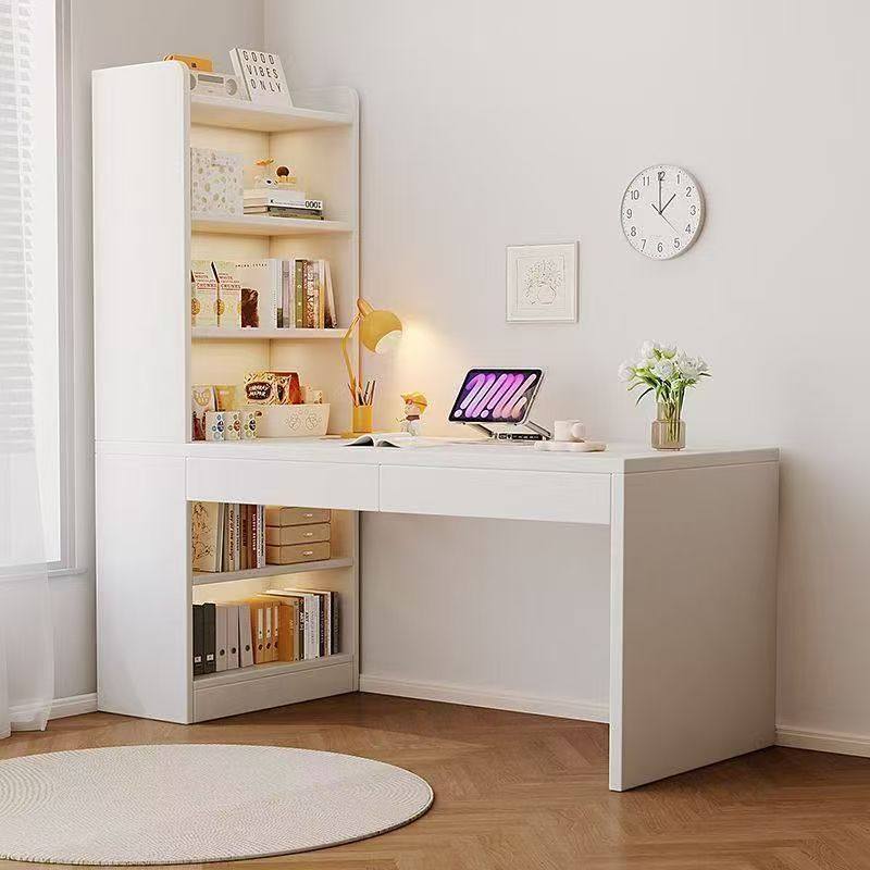 电脑桌实木家用奶油风书架一体学生卧室学习写字台白色转角办公桌