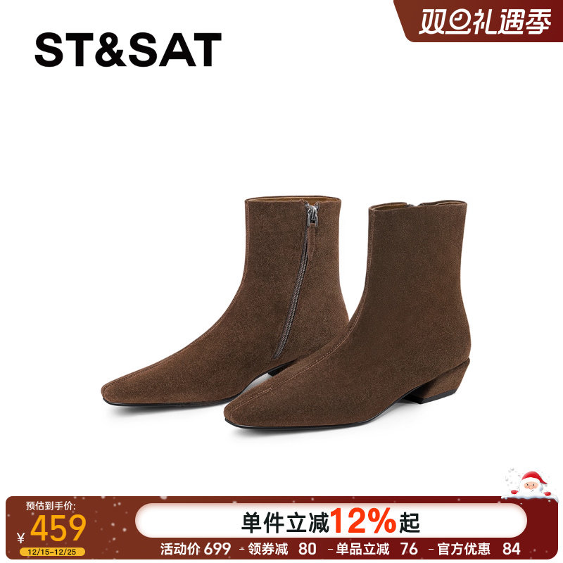 星期六法式磨砂短靴女2025秋冬方头粗跟侧拉链瘦瘦靴真皮低跟裸靴