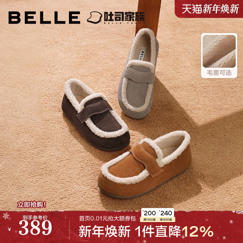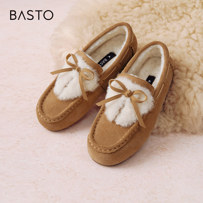 百思图冬季商场新款真皮休闲加绒毛毛鞋豆豆鞋女保暖棉鞋J7675DM4