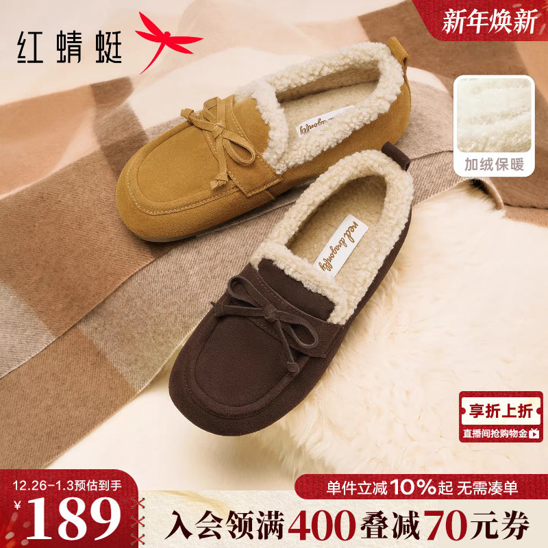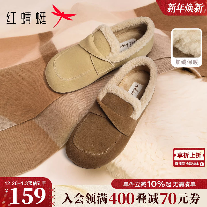 红蜻蜓加绒勃肯鞋女2025冬季新款女鞋一脚蹬豆豆毛毛鞋棉鞋雪地靴