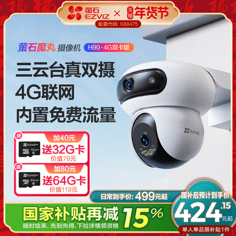 萤石魔丸H90室外双摄云台360全景智能AI无线网络摄像头远程4G监控