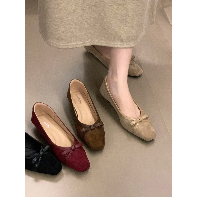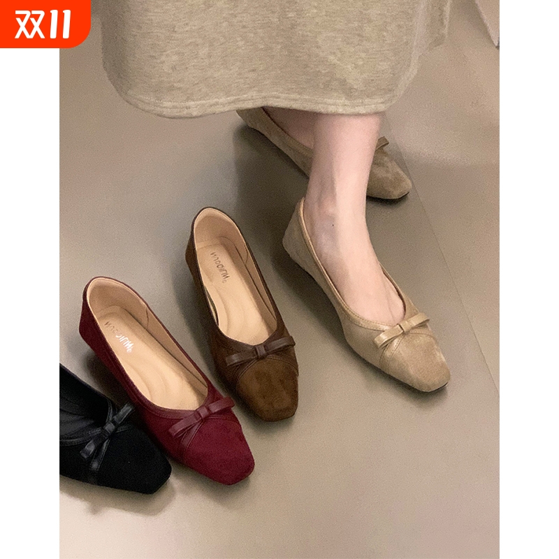 断码处理复古蝴蝶结低跟单鞋女温柔风绒面奶奶鞋法式方头浅口瓢鞋