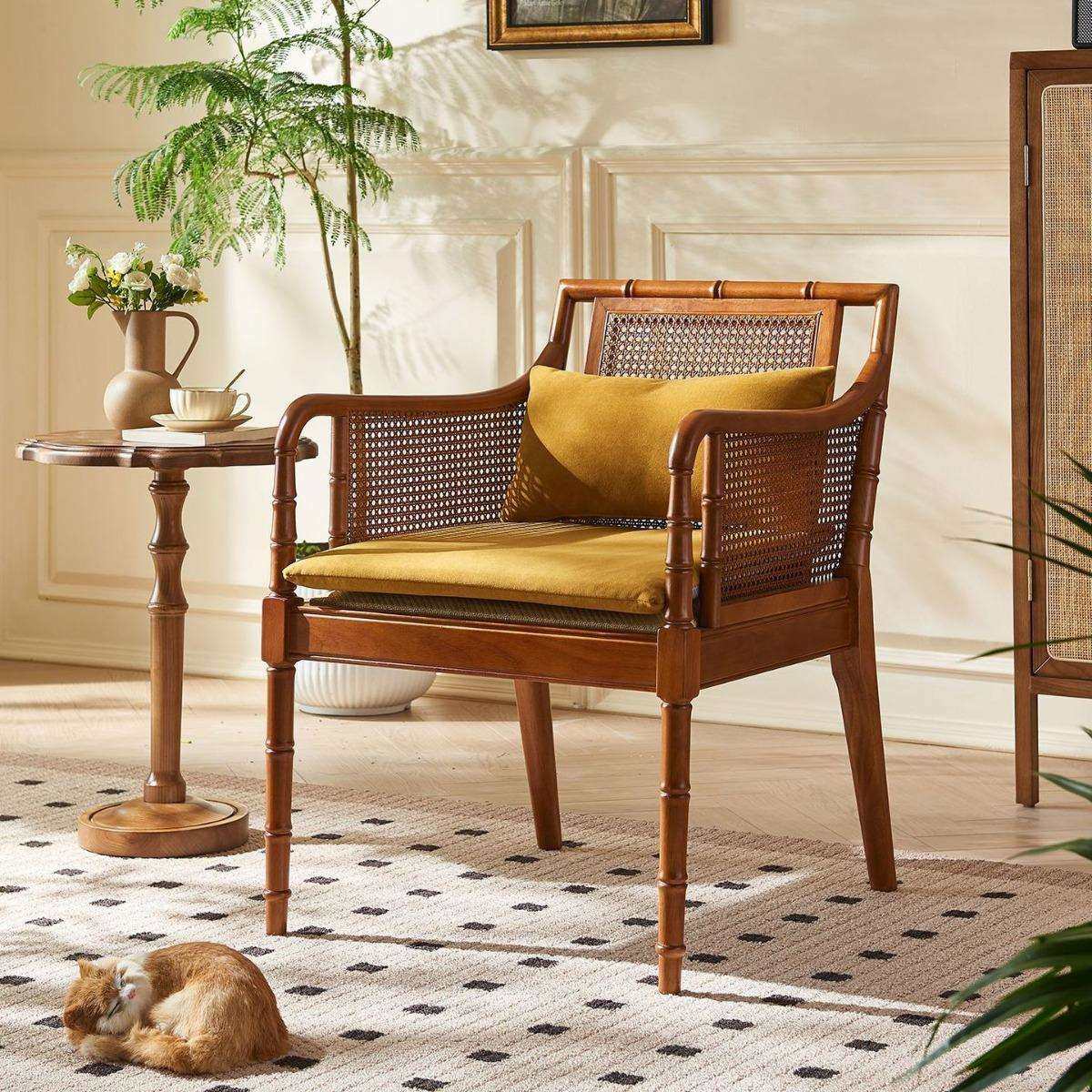 法式复古单人实木休闲椅诧寂风客厅家用看书藤编设计师美式沙发椅