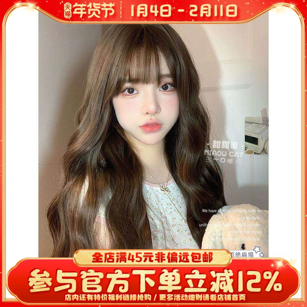 一口喵假发女日常网红长卷发新款自然逼真齐刘海全头套【甜甜圈】