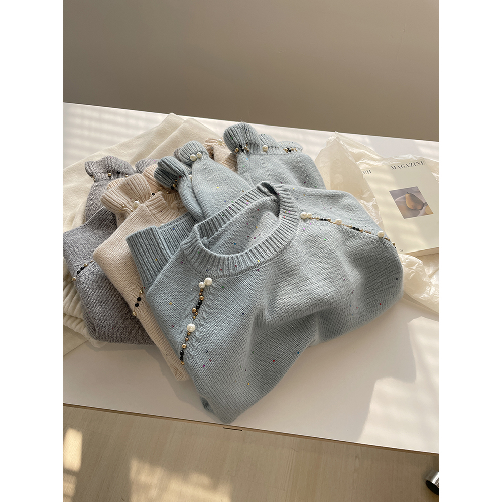 温柔系~重工钉珠亮片套头毛衣女!24冬季喇叭袖小个子圆领针织衫