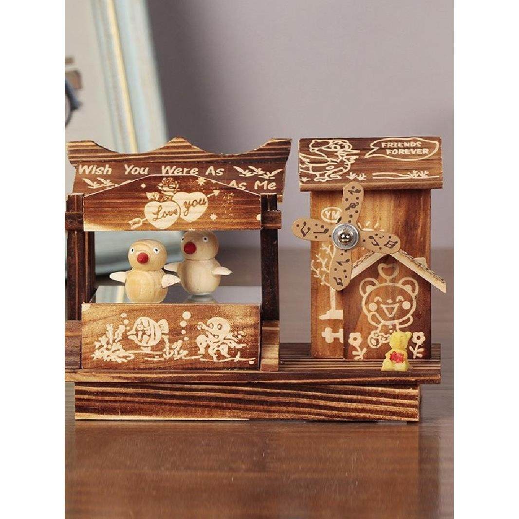 M2523 动态旋转小熊八音盒 木质风车音乐盒 创意带笔筒 学生礼品